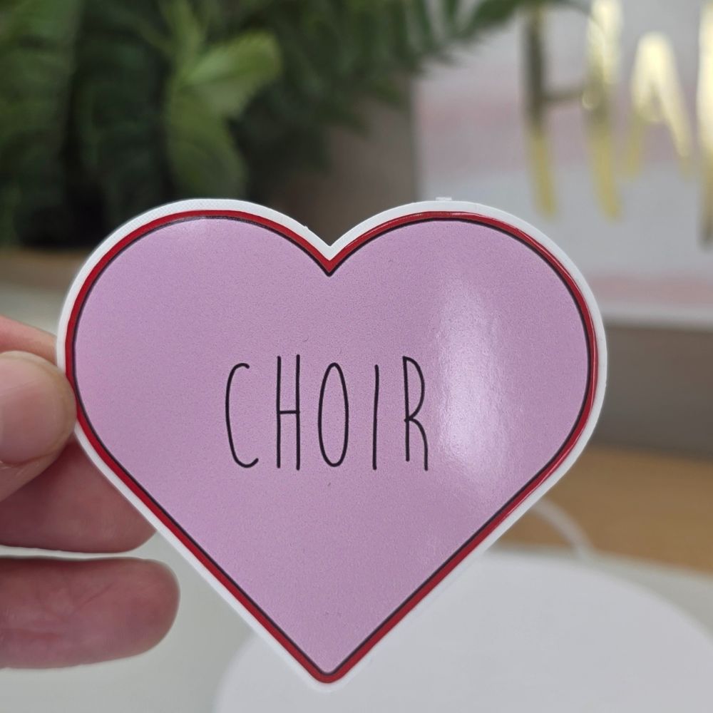 Simple, sweet, and full of choir love. This heart-shaped “Choir” sticker is perfect for choir students, directors, and anyone who sings their heart out—great for planners, folders, and water bottles.