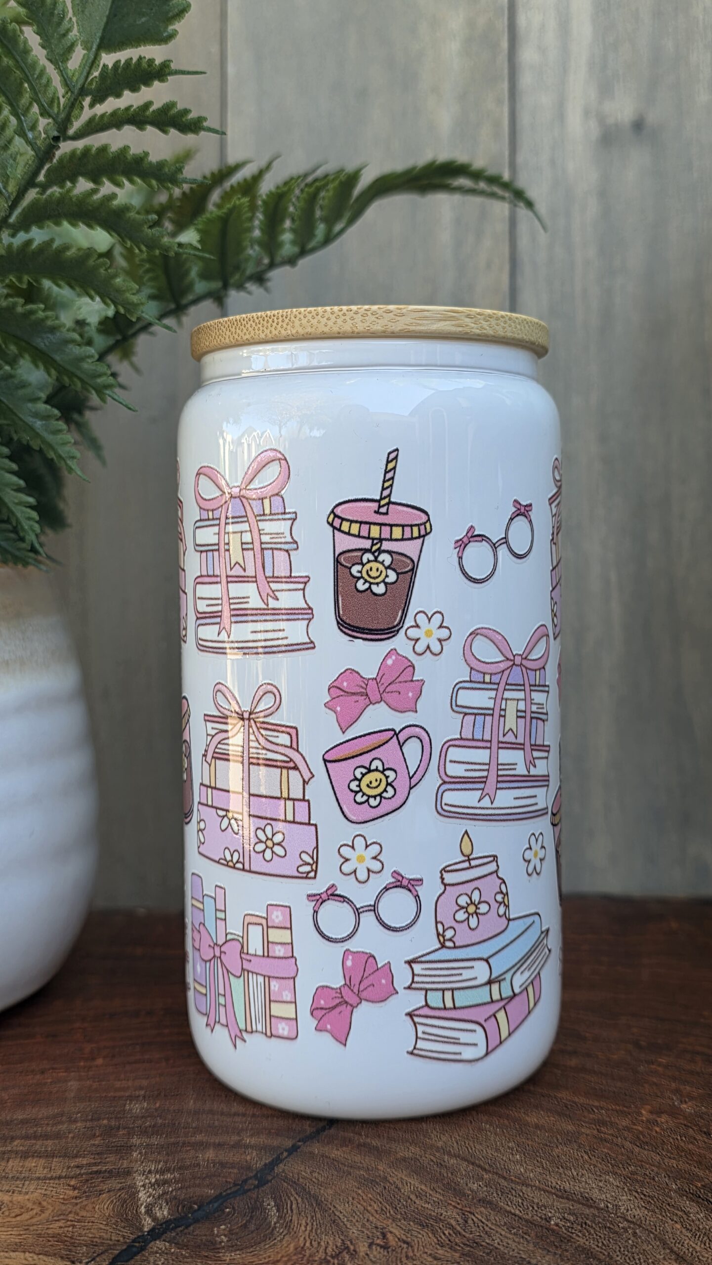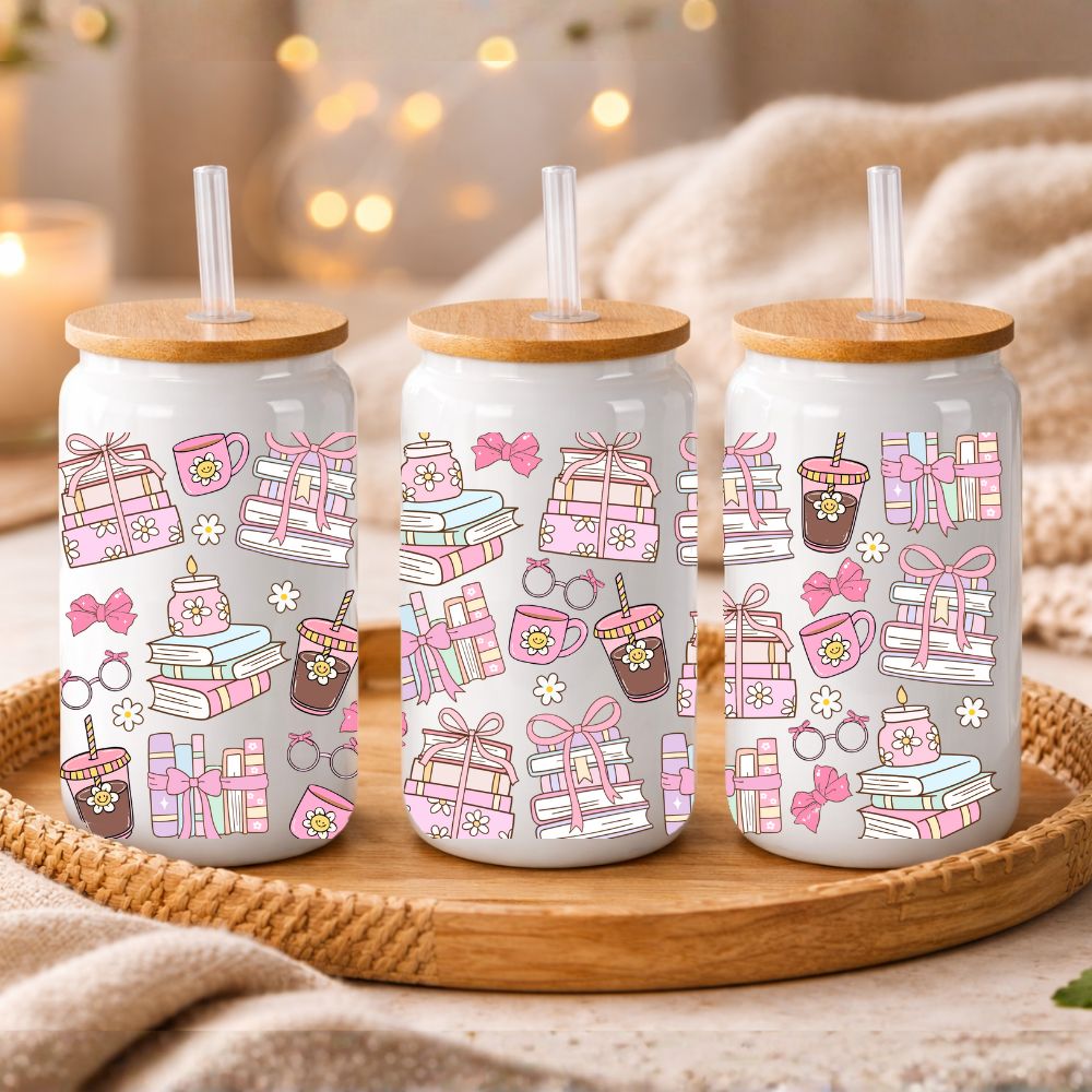 16 oz white Libbey glass cup featuring vibrant UV DTF designs—durable, glossy, and made to hit all the right notes.